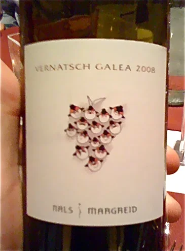 Cantina Nals Margreid, Vernatsch Galea Alto Adige DOC 2008 (nella foto) - Da un vigneto storico, con viti tra gli 80 e oltre 100 anni, ecco una "signora" Schiava. La fanno macerare sulle vinacce, e poi affinare in botti grandi. Colore tipicamente rubino, bellissimo nella sua trasparenza, con quel gustino leggero di mandorla (altra tipicità), e poi frutti rossi. Elegante, profumata, morbida, godibilissima. Una folgorazione. Purtroppo non posso dirvi il prezzo (ma si sa, un gentiluomo gode e tace...).